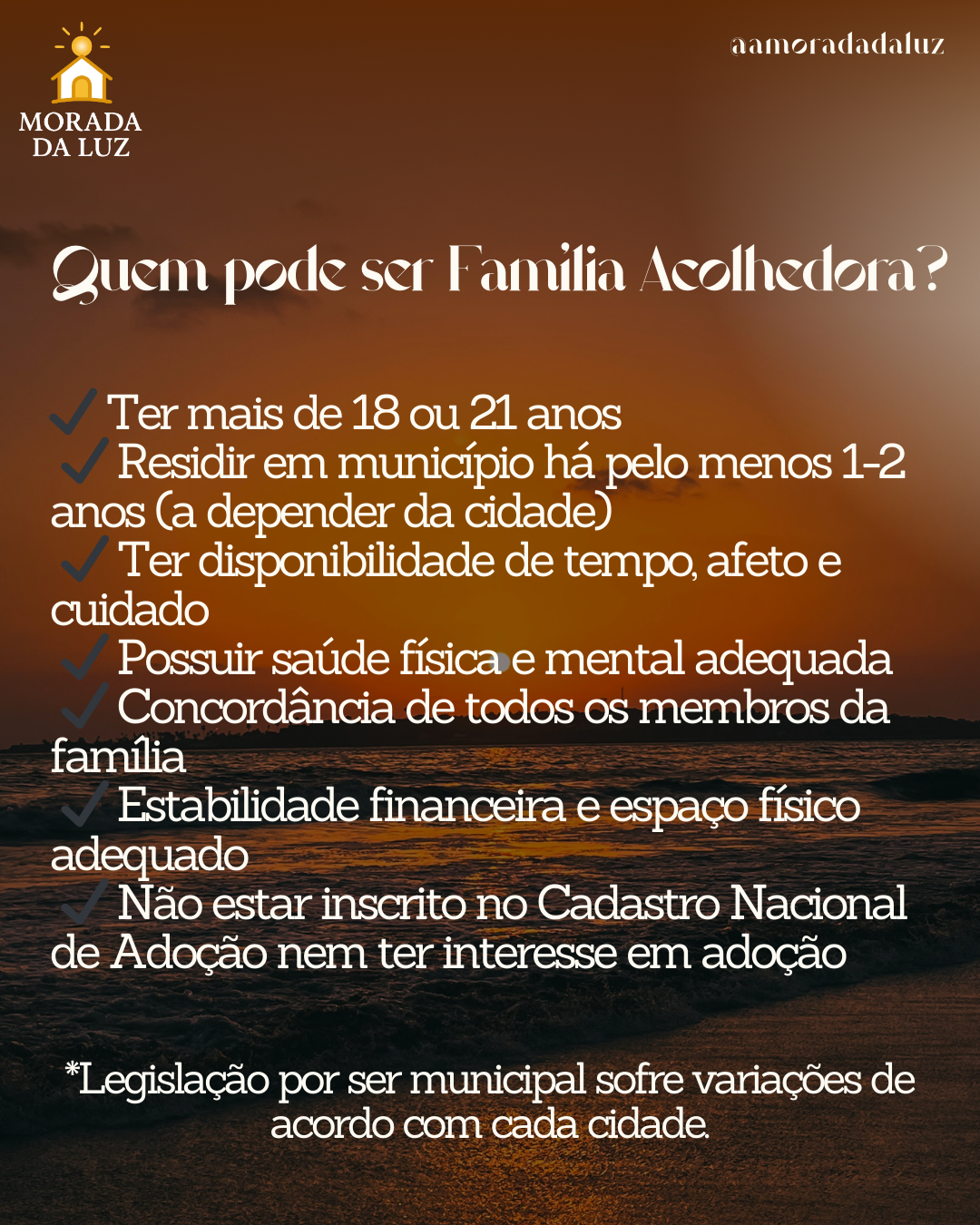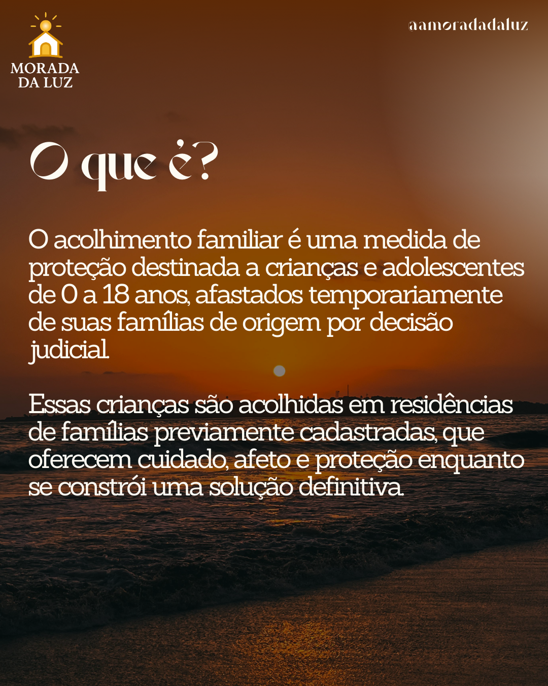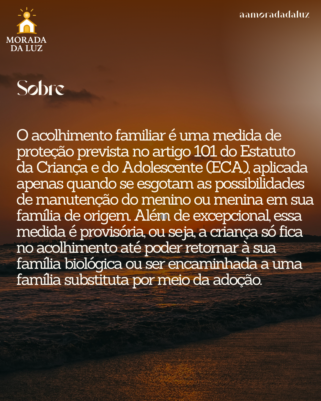 O Estatuto da Criança e do Adolescente garante, no art. 19, o direito de toda criança à convivência familiar. E o art. 34 determina que o acolhimento familiar tenha preferência sobre o institucional, sempre de forma temporária e excepcional.